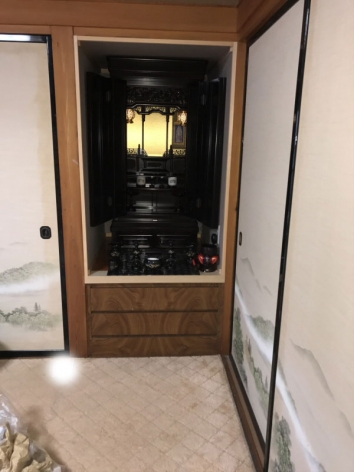 紫檀調43-18をお届け致しました 仏壇お届け情報 Twitter Facebook はてブ Pocket LINE コピー 2021.09.24商品検索 S様ありがとうございました。作り付けの洋服クローゼットの引出を残し仏間に改装の為、仏間の内高が低くなりましたのでお仏壇の下台を2cmカット加工して納めました。ピッタリ納まりましたので喜んで頂きました。お届け仏壇紫檀調43-18 台付仏壇お部屋に直接置いても下に戸袋などがある仏間に納めても丁度良いサイズのお仏壇ですお届け仏具吊灯篭・十三仏掛軸・リン一式・国光菊唐草7点セット(写真に写っている仏具全品)氏名・お届け先住所など個人を特定できる情報は掲載を控えさせて頂いております